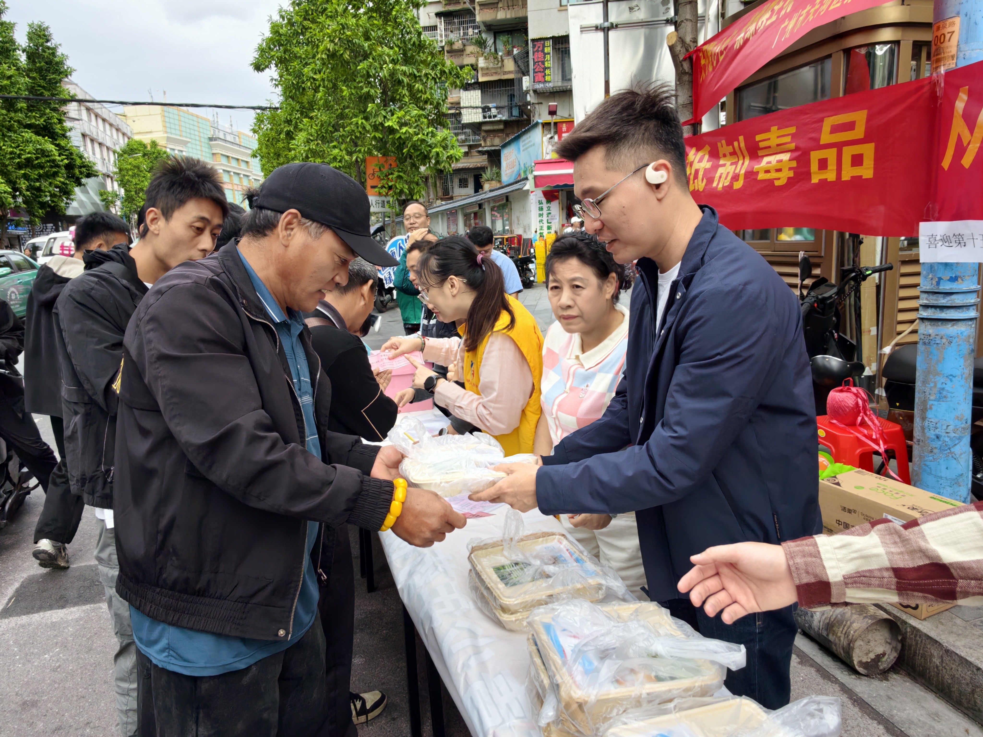 活动现场,由爱心企业捐赠的100份健康素食餐盒成为传递温暖的生动载体。天河区禁毒协会秘书长梁国勇、沙河街平安法治办公室干部杨玉兰及其他工作人员有序派发素食餐盒,在传递健康饮食理念的同时,也为市场从业人员送上实实在在的关怀,展现出“慈善暖人心、素食唤生机”的活动内涵,呼应了全民全运、健康同行的时代主题。