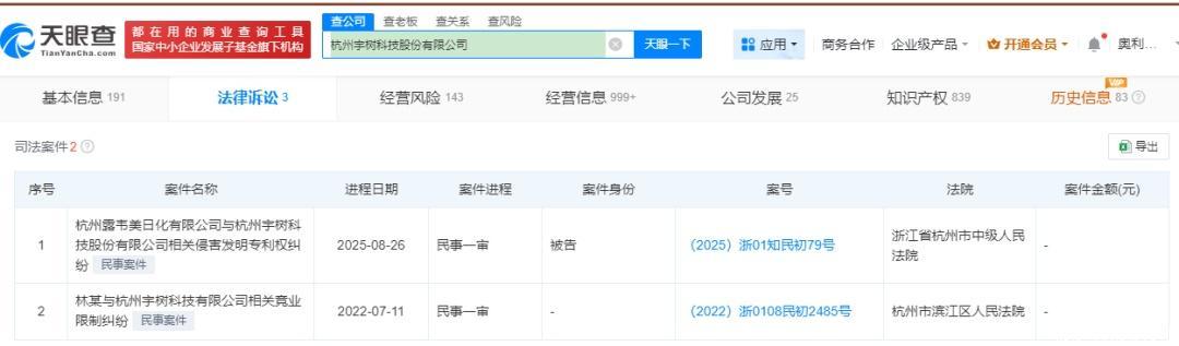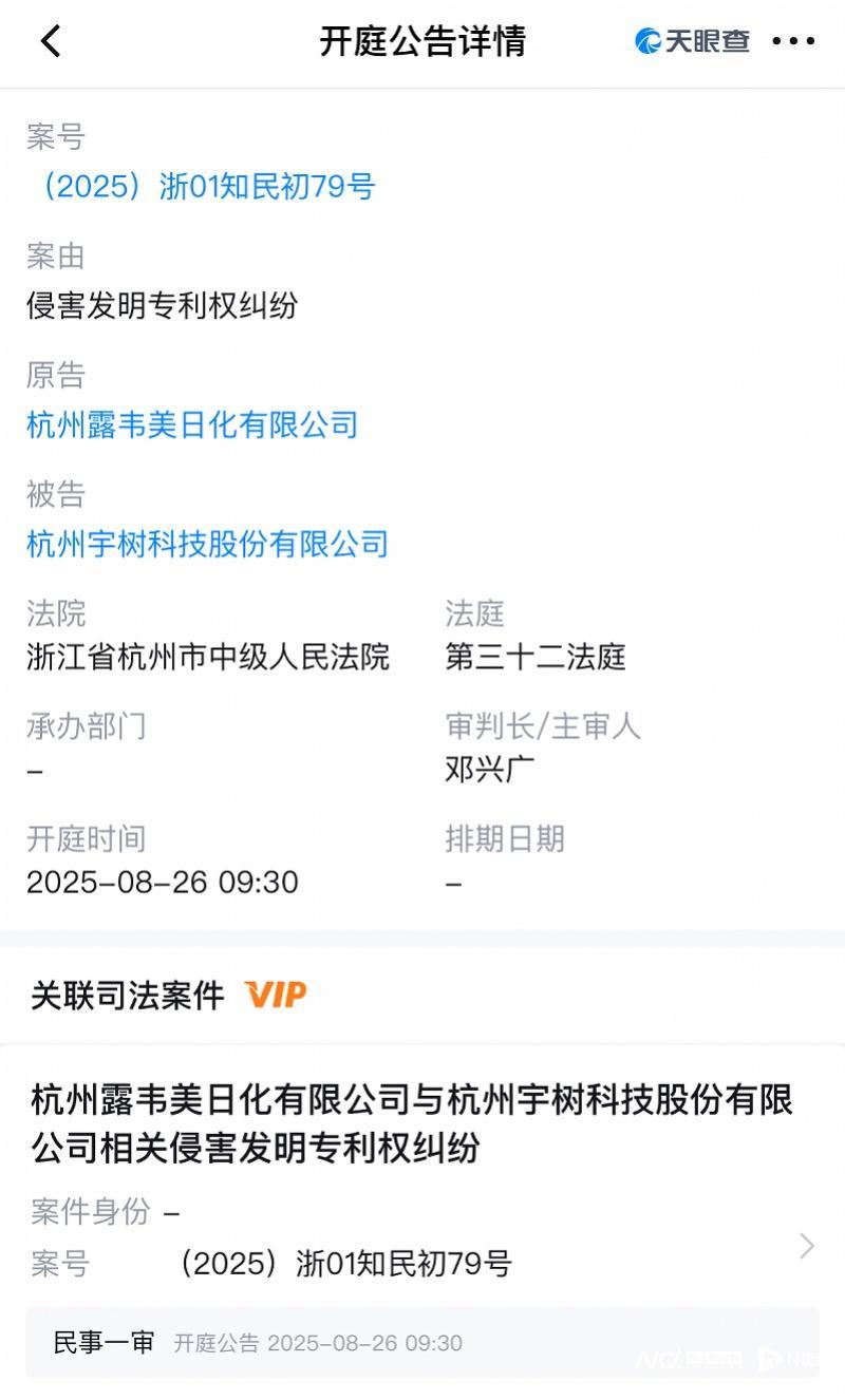南都N视频记者从天眼查了解获悉,杭州露韦美日化有限公司(以下简称露韦美)与杭州宇树科技股份有限公司(以下简称宇树科技)相关侵害发明专利权纠纷的诉讼公开,相关案件将于2025年8月26日在杭州市中级人民法院开庭审理。南都N视频记者采访宇树科技方面,截至发稿尚未获得相关回复。